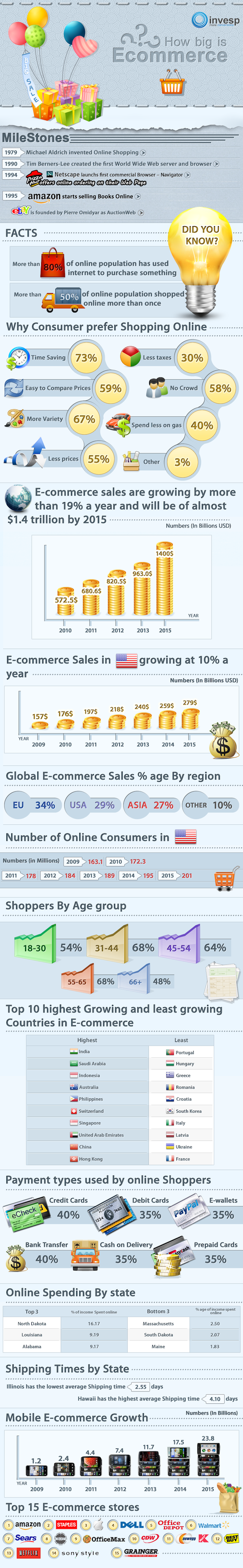 Selon son infographie l’Europe représente 1/3 des ventes en ligne par rapport au marché mondial du e-commerce, le marché du e-commerce mondial devrait représenter 1400 milliards de dollars en 2015, que l’Europe est le marché le plus important du monde et l’Inde, le plus porteur.